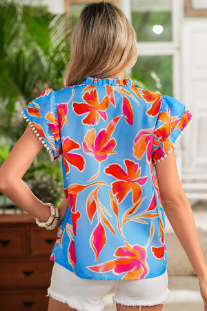 Sky Blue Floral Print V Neck Pom Trim Short Sleeve Blouse