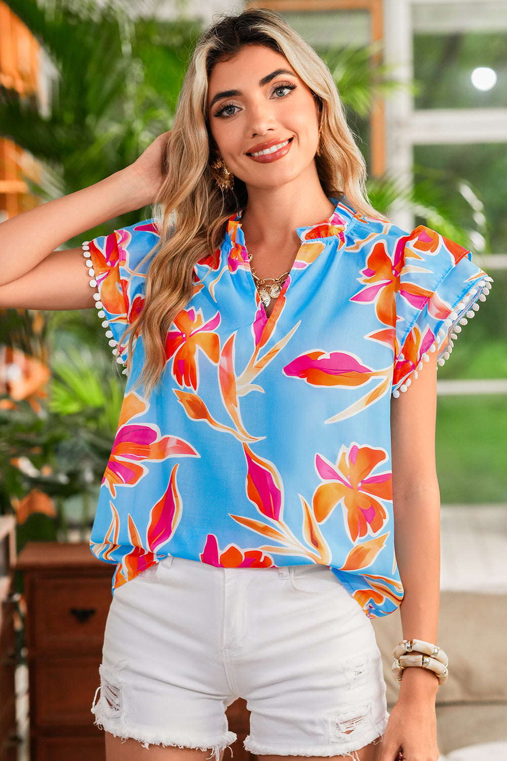 Der V-Ausschnitt sorgt für eine elegante Note, während die kurzen Ärmel die Bluse perfekt für warme Tage machen. Der verspielte Pom-Pom-Besatz und die feinen Rüschenakzente verleihen ihr einen unkonventionellen, lebendigen Charakter. Abgerundet wird das Design durch den leuchtend himmelblauen Farbton und den aufwendigen Blumendruck, die für einen erfrischenden, auffälligen Look sorgen.