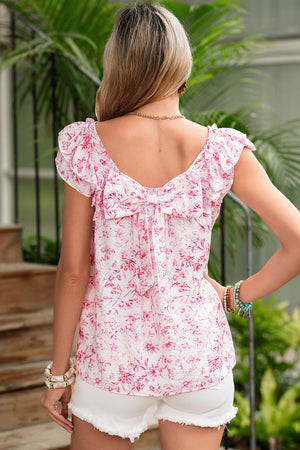 Sky Blue Floral Ruffle Short Sleeve Bow Back Blouse