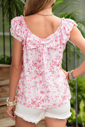 Der feine Blumendruck sorgt für ein frisches, feminines Flair, während die Rüschen- und Volantdetails jeder Bewegung einen Hauch von Eleganz verleihen. Ein besonderes Highlight ist das verspielte Schleifendesign am Rücken, das diese Bluse zu einem stilvollen Statement-Piece macht – perfekt für Freizeit, Ausflüge oder sommerliche Anlässe.