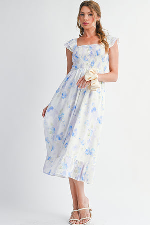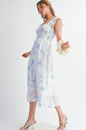 Sky Blue Floral Smocked High Waist Ruffle Sleeveless Long Dress