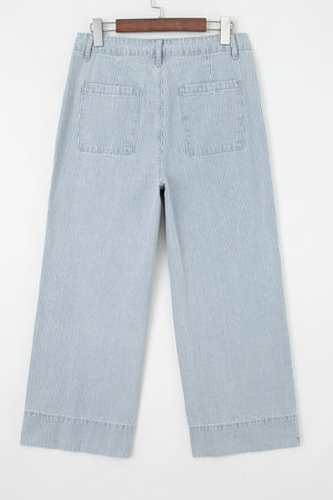 Sky Blue Striped Button Flap Pocket Cuffed Hem Wide Leg Jeans