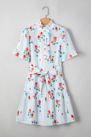 Sky Blue Striped Floral Print Ruffle Belted Mini Dress