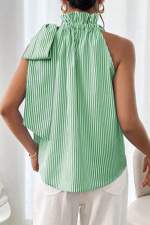 Mit dem Sky Blue Striped Frill Neck Tie Knot Sleeveless Top erhältst du ein Kleidungsstück, das sommerliche Frische und elegante Verspieltheit perfekt verbindet. Ein Must-have für Frauen, die Stilbewusstsein und Komfort vereinen möchten – von casual bis chic.