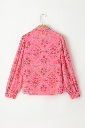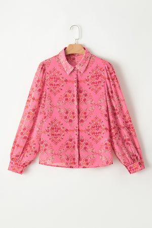 Strawberry Pink Floral Print Collared Button Up Puff Sleeve Shirt
