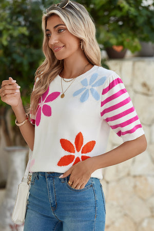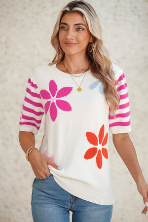 White Colorful Floral Print Striped Sleeve Knitted Tee
