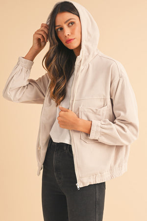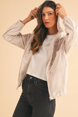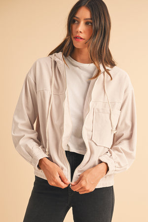 White Corduroy Drawstring Hooded Pocket Zip Up Jacket