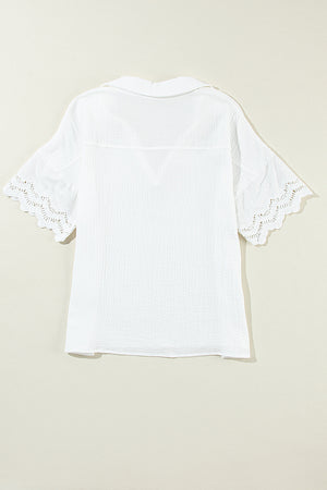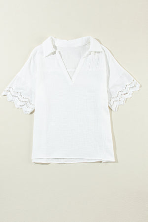 White Crinkled Lace Splicing Sleeve Collared V Neck Blouse