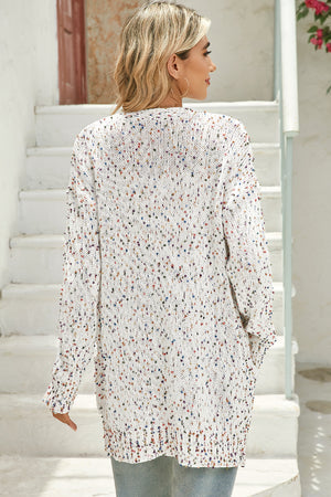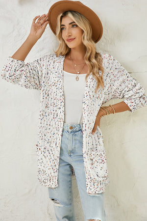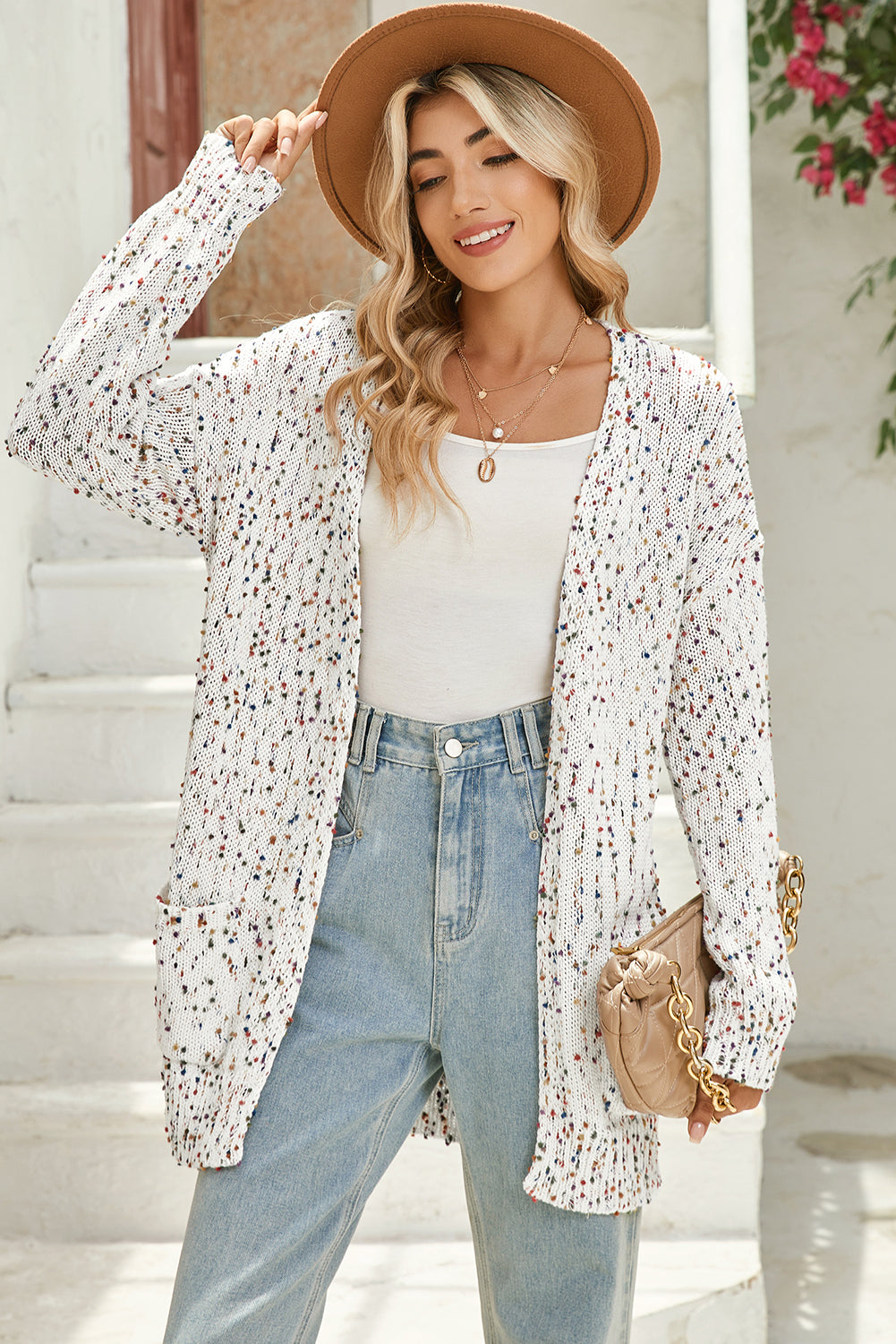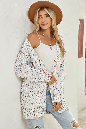 White Dotted Rib Knit Open Front Pocketed Cardigan