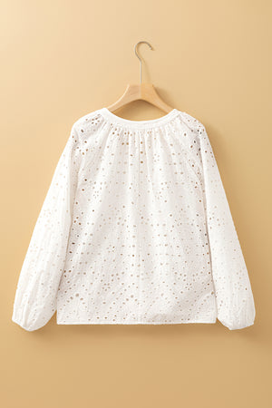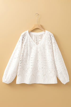 White Eyelet Embroidered Puff Sleeve V Neck Blouse