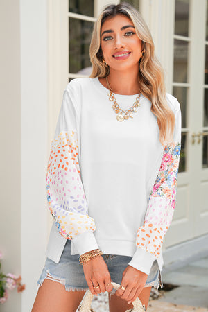 White Floral Dotted Print Patchwork Sleeve High Low Sweatshirt