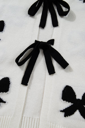 White Lace-Up Front Bow Pattern Round Neck Knit Cardigan