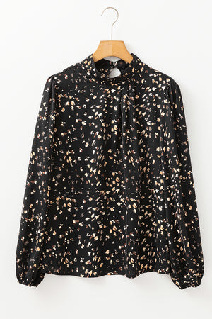 White Leopard Print Puff Sleeve Mock Neck Pleated Blouse