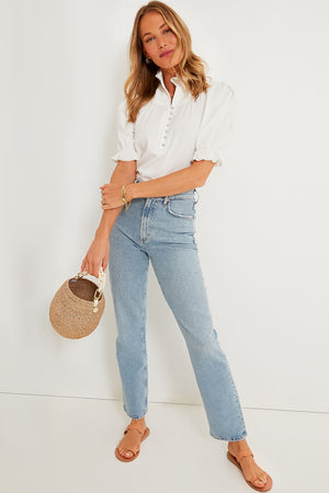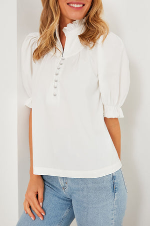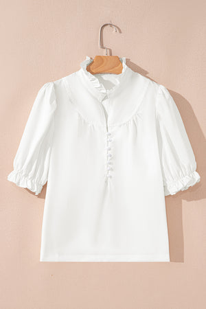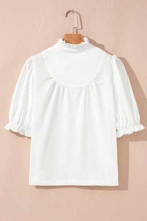 White Solid Color Frill Trim Puff Sleeve Blouse