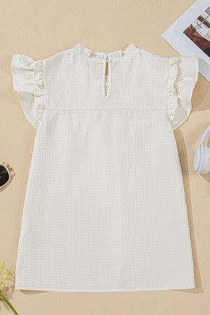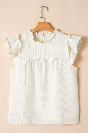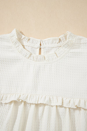 White Solid Color Ruffle Trim Waffle Textured Blouse