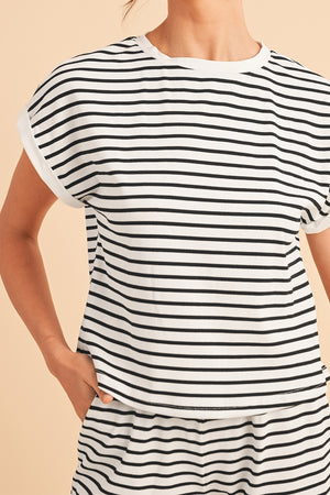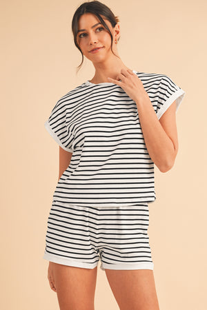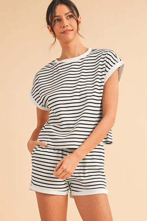 Heim White Stripe Contrast Trim Rib Tee and Pocketed Shorts Set