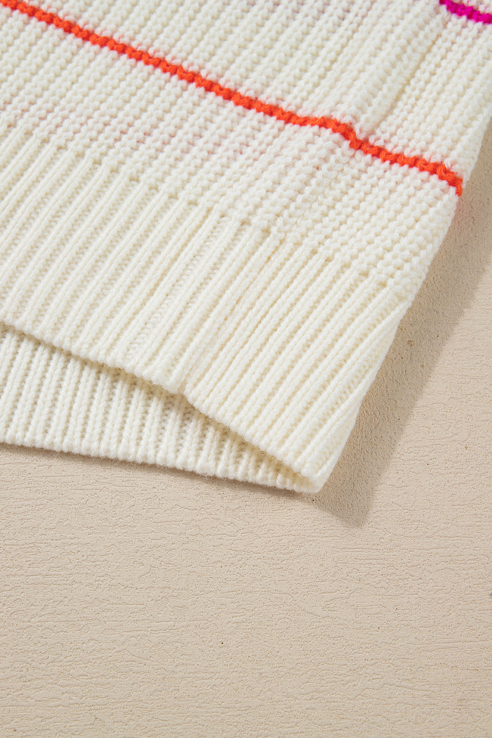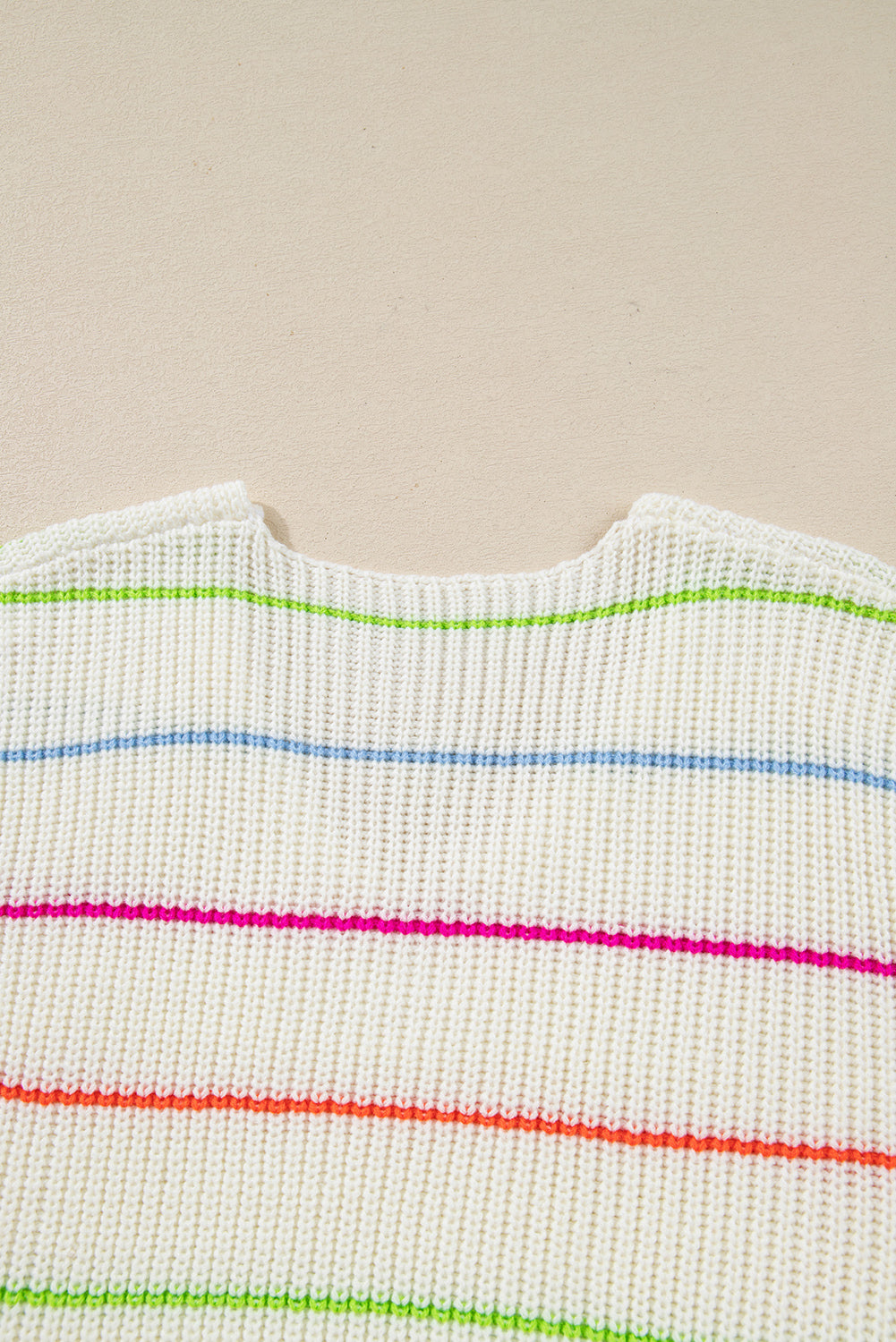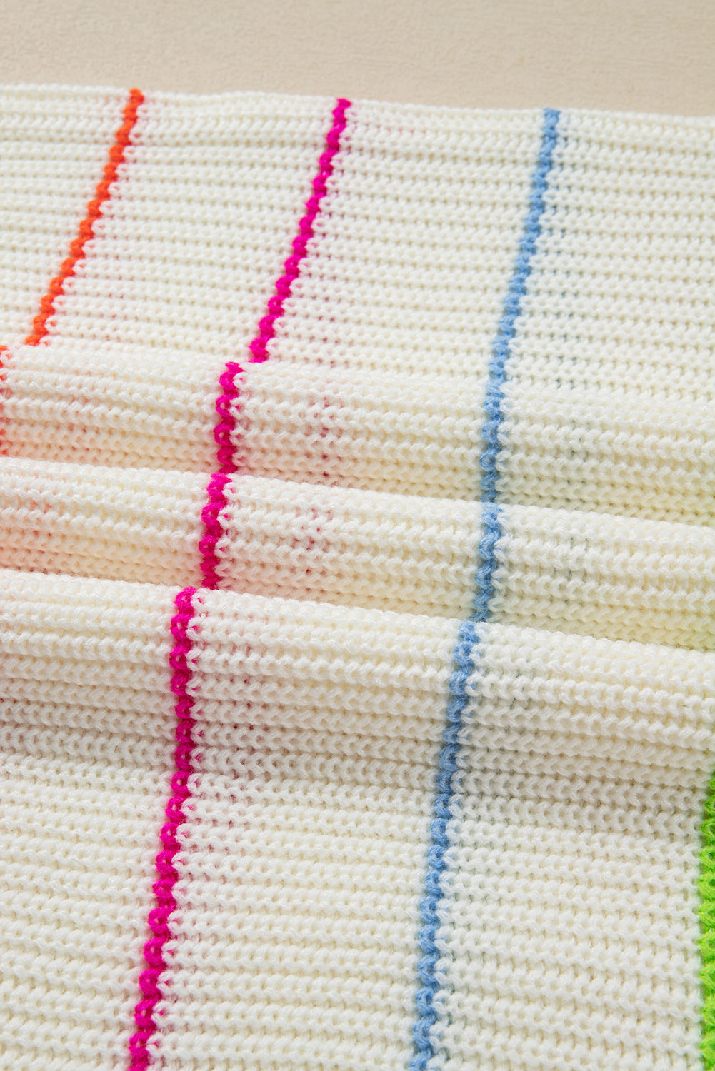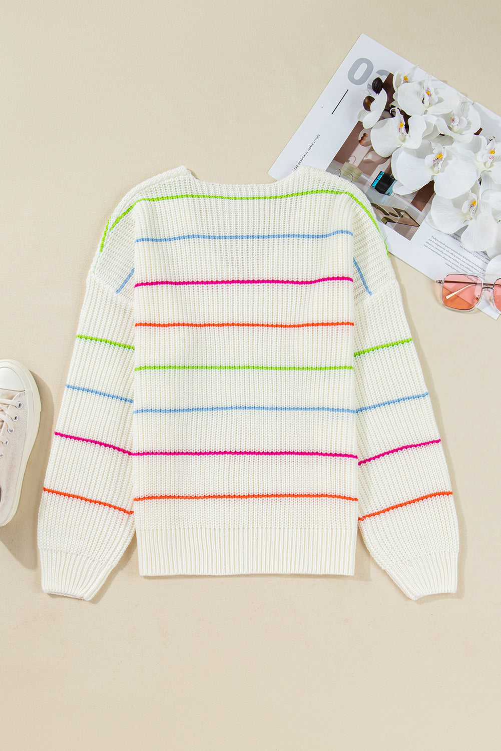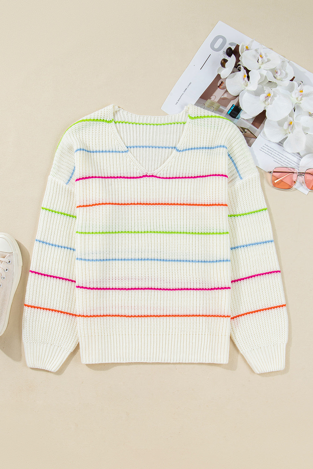 Dieses elegante Strick-Piece verbindet klassische Eleganz mit lässigem Komfort. Der weiße Pullover mit Streifenmuster und der V-Ausschnitt sorgen für einen femininen, zeitlosen Look, der sich sowohl casual als auch chic kombinieren lässt.