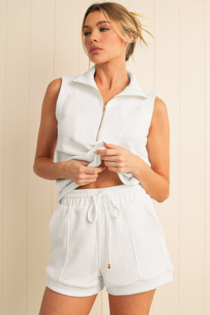 White Textured Half Zip Tank Top Drawstring Shorts Set