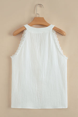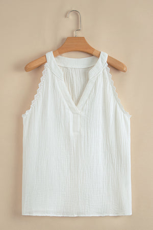 White V Neck Lace Trim Crinkled Sleeveless Top
